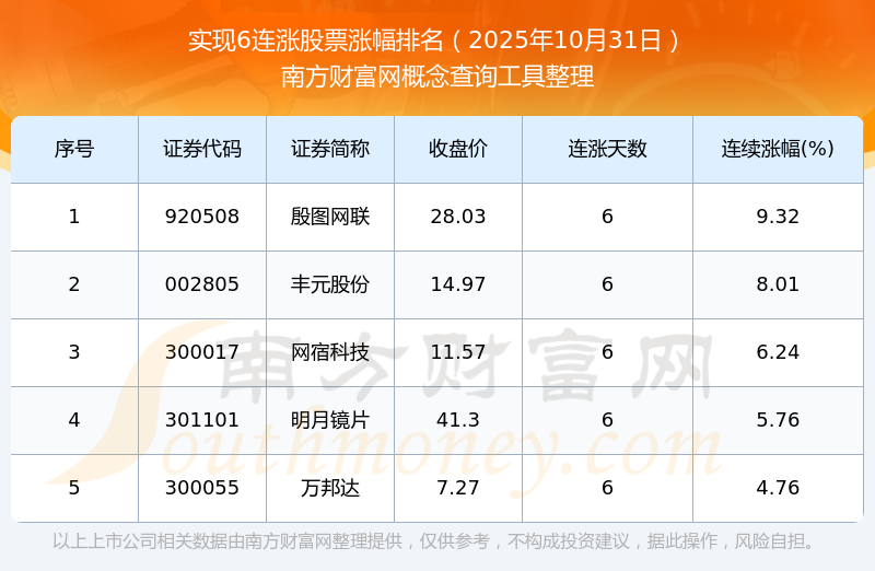 2025年10月31日實現(xiàn)6連漲股票漲幅排名