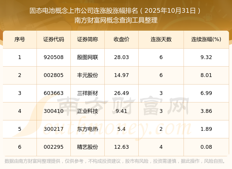 2025年10月31日固態(tài)電池概念上市公司連漲股漲幅排名