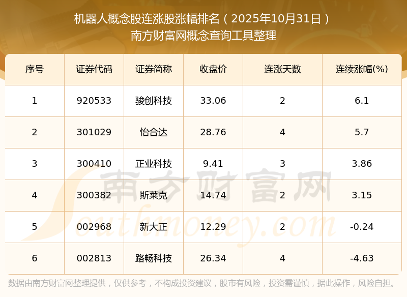 2025年10月31日機(jī)器人概念股連漲股漲幅排名