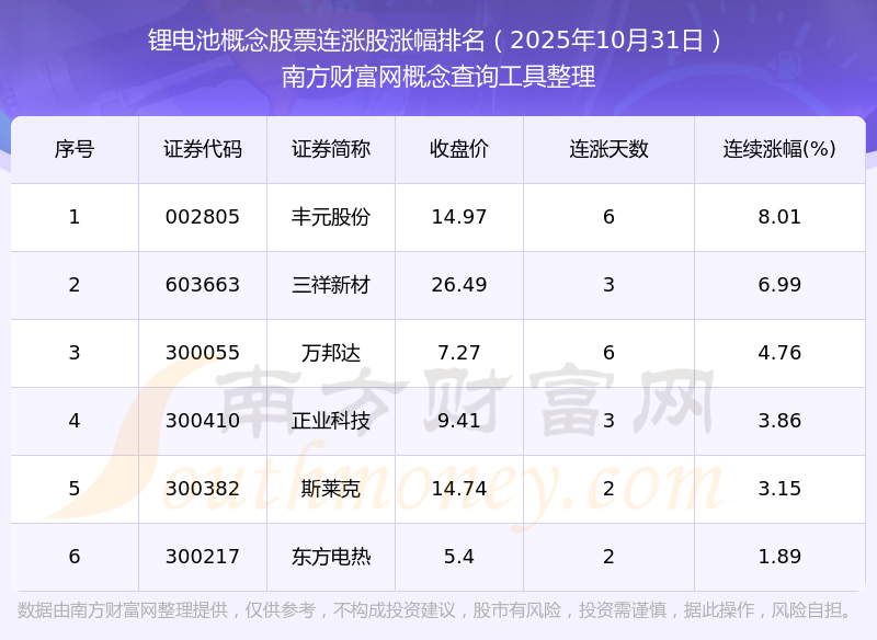 根據(jù)南方財富網(wǎng)概念查詢工具數(shù)據(jù)統(tǒng)計,截止2025年10月31日收盤,鋰電池概念股票共有6只個股實(shí)現(xiàn)連漲。其中連續(xù)漲幅較大的個股有豐元股份、三祥新材、萬邦達(dá)等,連續(xù)漲幅分別為8.01%、6.99%、4.76%。