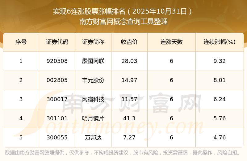 2025年10月31日實現(xiàn)6連漲股票漲幅排名