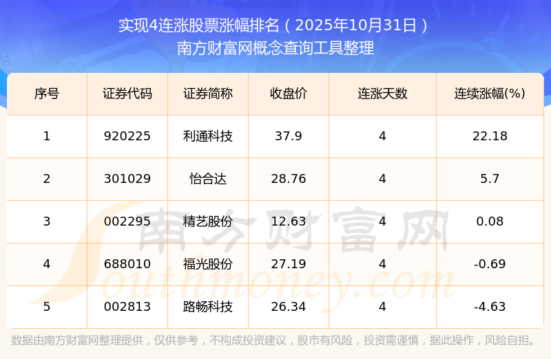根據(jù)南方財(cái)富網(wǎng)概念查詢工具數(shù)據(jù)統(tǒng)計(jì),截止2025年10月31日收盤,共有5只個(gè)股實(shí)現(xiàn)4天連漲。其中連續(xù)漲幅較大的個(gè)股有利通科技、怡合達(dá)、精藝股份等,連續(xù)漲幅分別為22.18%、5.70%、0.08%。