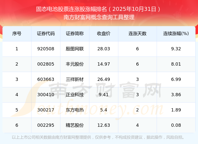 根據(jù)南方財富網(wǎng)概念查詢工具數(shù)據(jù)統(tǒng)計(jì),截止2025年10月31日收盤,固態(tài)電池股票共有6只個股實(shí)現(xiàn)連漲。其中連續(xù)漲幅較大的個股有殷圖網(wǎng)聯(lián)、豐元股份、三祥新材等,連續(xù)漲幅分別為9.32%、8.01%、6.99%。
