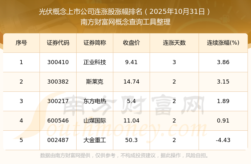 2025年10月31日光伏概念上市公司連漲股漲幅排名