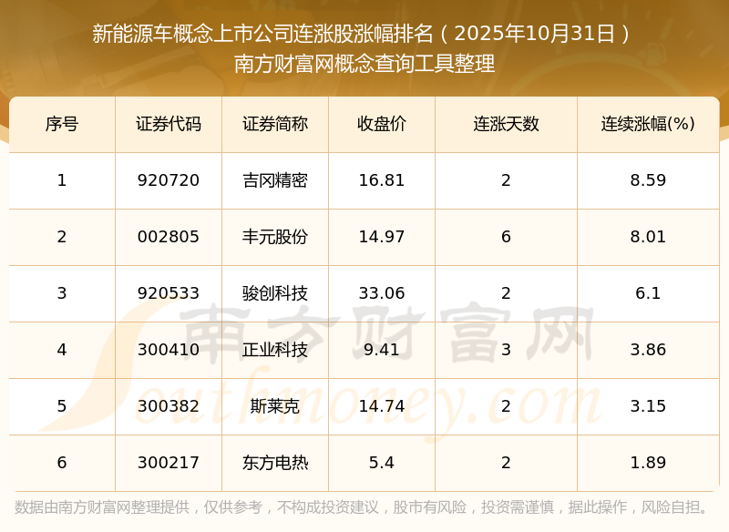 根據(jù)南方財富網(wǎng)概念查詢工具數(shù)據(jù)統(tǒng)計,截止2025年10月31日收盤,新能源車概念上市公司共有6只個股實現(xiàn)連漲。其中連續(xù)漲幅較大的個股有吉岡精密、豐元股份、駿創(chuàng)科技等,連續(xù)漲幅分別為8.59%、8.01%、6.10%。