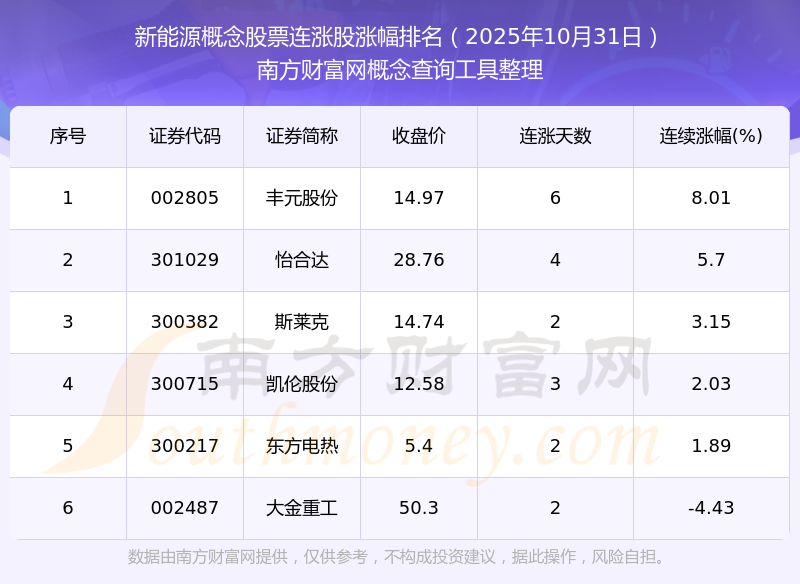根據(jù)南方財富網(wǎng)概念查詢工具數(shù)據(jù)統(tǒng)計,截止2025年10月31日收盤,新能源概念股票共有6只個股實(shí)現(xiàn)連漲。其中連續(xù)漲幅較大的個股有豐元股份、怡合達(dá)、斯萊克等,連續(xù)漲幅分別為8.01%、5.70%、3.15%。