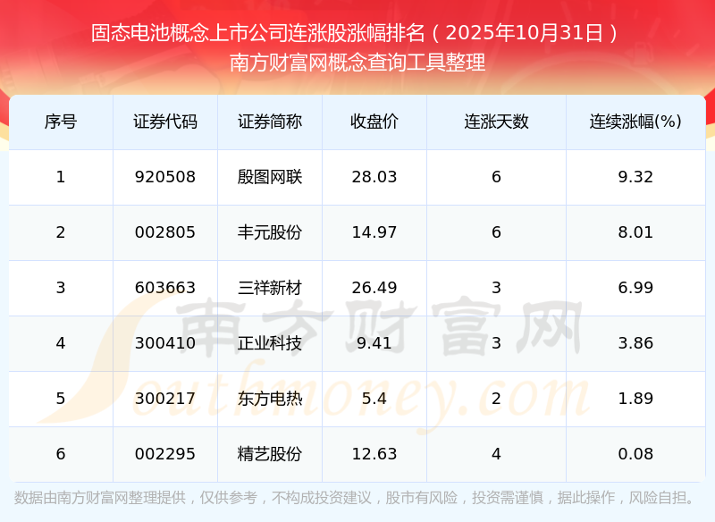 根據(jù)南方財富網(wǎng)概念查詢工具數(shù)據(jù)統(tǒng)計,截止2025年10月31日收盤,固態(tài)電池概念上市公司共有6只個股實現(xiàn)連漲。其中連續(xù)漲幅較大的個股有殷圖網(wǎng)聯(lián)、豐元股份、三祥新材等,連續(xù)漲幅分別為9.32%、8.01%、6.99%。