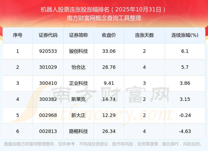 2025年10月31日機(jī)器人股票連漲股漲幅排名