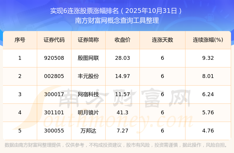 根據(jù)南方財(cái)富網(wǎng)概念查詢工具數(shù)據(jù)統(tǒng)計(jì),截止2025年10月31日收盤,共有5只個(gè)股實(shí)現(xiàn)6天連漲。其中連續(xù)漲幅較大的個(gè)股有殷圖網(wǎng)聯(lián)、豐元股份、網(wǎng)宿科技等,連續(xù)漲幅分別為9.32%、8.01%、6.24%。 2025年10月31日實(shí)現(xiàn)6連漲股票漲幅排名 數(shù)據(jù)由南方財(cái)富網(wǎng)整理提供,