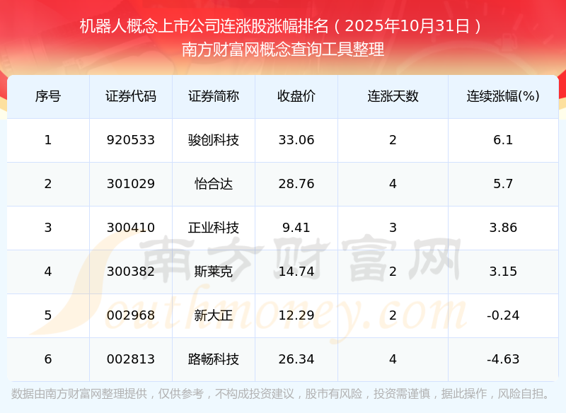 根據(jù)南方財富網(wǎng)概念查詢工具數(shù)據(jù)統(tǒng)計,截止2025年10月31日收盤,機器人概念上市公司共有6只個股實現(xiàn)連漲。其中連續(xù)漲幅較大的個股有駿創(chuàng)科技、怡合達、正業(yè)科技等,連續(xù)漲幅分別為6.10%、5.70%、3.86%。