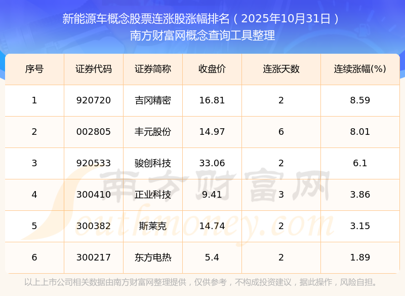 根據(jù)南方財(cái)富網(wǎng)概念查詢工具數(shù)據(jù)統(tǒng)計(jì),截止2025年10月31日收盤,新能源車概念股票共有6只個(gè)股實(shí)現(xiàn)連漲。其中連續(xù)漲幅較大的個(gè)股有吉岡精密、豐元股份、駿創(chuàng)科技等,連續(xù)漲幅分別為8.59%、8.01%、6.10%。