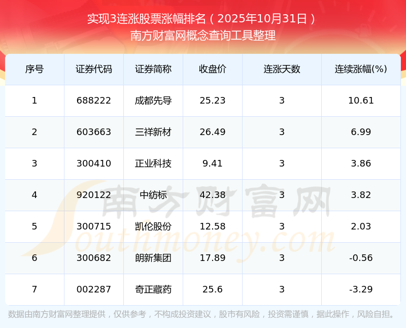 根據(jù)南方財(cái)富網(wǎng)概念查詢工具數(shù)據(jù)統(tǒng)計(jì),截止2025年10月31日收盤,共有7只個(gè)股實(shí)現(xiàn)3天連漲。其中連續(xù)漲幅較大的個(gè)股有成都先導(dǎo)、三祥新材、正業(yè)科技等,連續(xù)漲幅分別為10.61%、6.99%、3.86%。 2025年10月31日實(shí)現(xiàn)3連漲股票漲幅排名 數(shù)據(jù)由南方財(cái)富網(wǎng)整理提供,