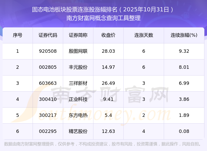 根據(jù)南方財(cái)富網(wǎng)概念查詢工具數(shù)據(jù)統(tǒng)計(jì),截止2025年10月31日收盤,固態(tài)電池板塊股票共有6只個(gè)股實(shí)現(xiàn)連漲。其中連續(xù)漲幅較大的個(gè)股有殷圖網(wǎng)聯(lián)、豐元股份、三祥新材等,連續(xù)漲幅分別為9.32%、8.01%、6.99%。