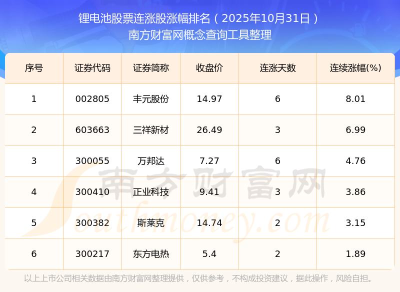 根據(jù)南方財(cái)富網(wǎng)概念查詢工具數(shù)據(jù)統(tǒng)計(jì),截止2025年10月31日收盤,鋰電池股票共有6只個(gè)股實(shí)現(xiàn)連漲。其中連續(xù)漲幅較大的個(gè)股有豐元股份、三祥新材、萬(wàn)邦達(dá)等,連續(xù)漲幅分別為8.01%、6.99%、4.76%。