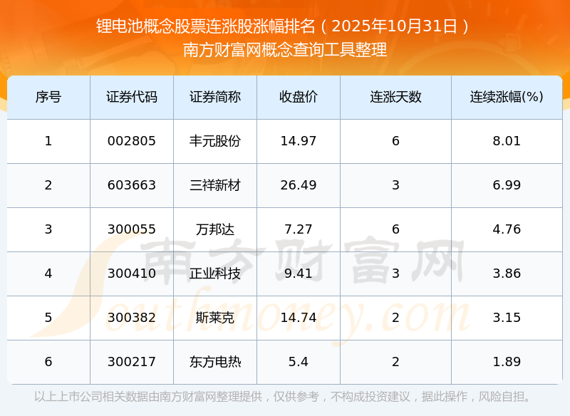 根據(jù)南方財富網(wǎng)概念查詢工具數(shù)據(jù)統(tǒng)計,截止2025年10月31日收盤,鋰電池概念股票共有6只個股實現(xiàn)連漲。其中連續(xù)漲幅較大的個股有豐元股份、三祥新材、萬邦達等,連續(xù)漲幅分別為8.01%、6.99%、4.76%。