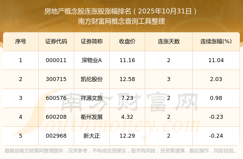 根據(jù)南方財(cái)富網(wǎng)概念查詢工具數(shù)據(jù)統(tǒng)計(jì),截止2025年10月31日收盤,房地產(chǎn)概念股共有5只個(gè)股實(shí)現(xiàn)連漲。其中連續(xù)漲幅較大的個(gè)股有深物業(yè)A、凱倫股份、祥源文旅等,連續(xù)漲幅分別為11.04%、2.03%、0.98%。