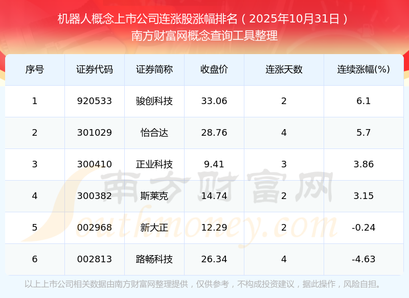 2025年10月31日機(jī)器人概念上市公司連漲股票漲幅排名