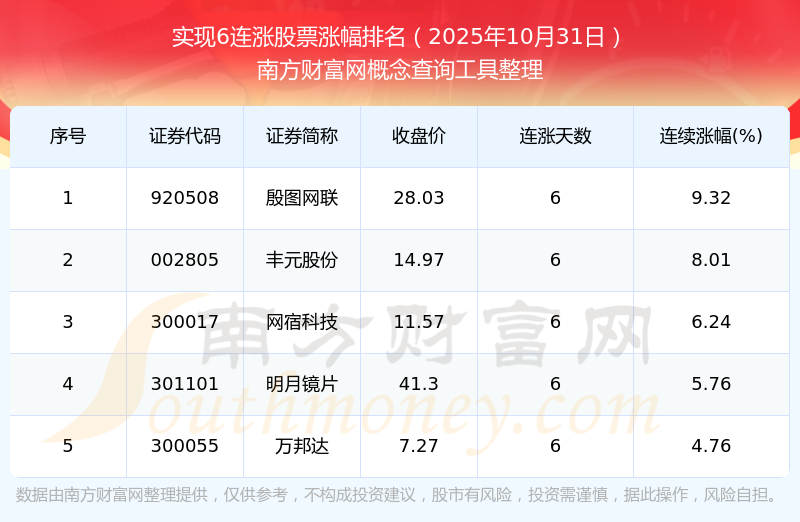 根據(jù)南方財富網(wǎng)概念查詢工具數(shù)據(jù)統(tǒng)計,截止2025年10月31日收盤,共有5只個股實現(xiàn)6天連漲。其中連續(xù)漲幅較大的個股有殷圖網(wǎng)聯(lián)、豐元股份、網(wǎng)宿科技等,連續(xù)漲幅分別為9.32%、8.01%、6.24%。