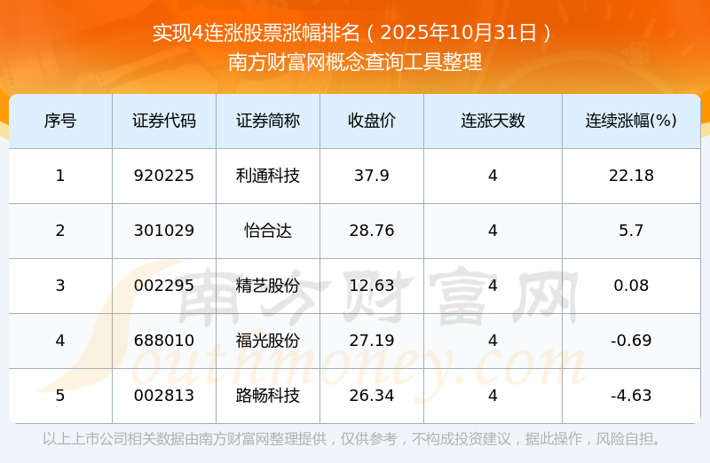 2025年10月31日實(shí)現(xiàn)4連漲股票漲幅排名