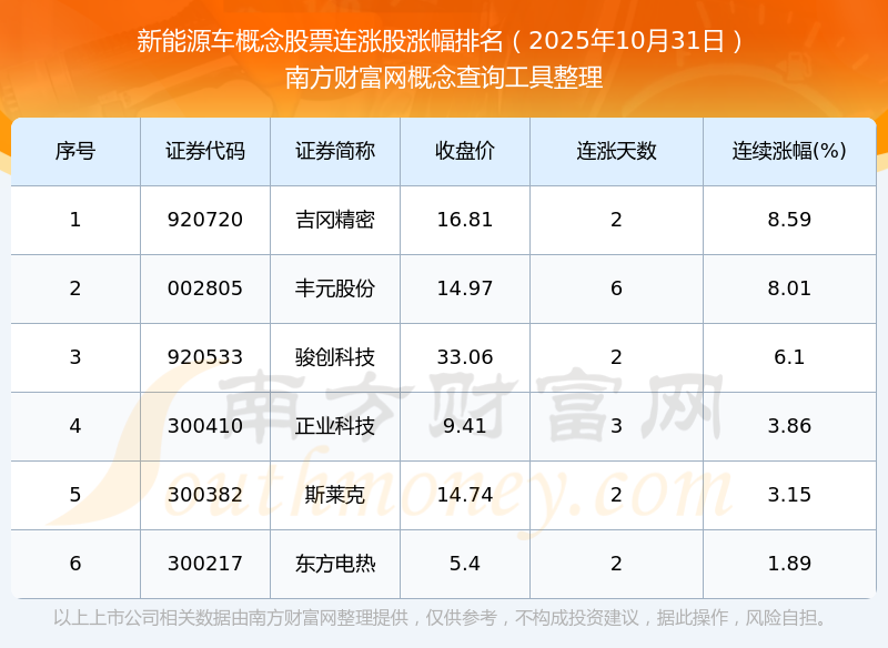 根據(jù)南方財(cái)富網(wǎng)概念查詢工具數(shù)據(jù)統(tǒng)計(jì),截止2025年10月31日收盤,新能源車概念股票共有6只個(gè)股實(shí)現(xiàn)連漲。其中連續(xù)漲幅較大的個(gè)股有吉岡精密、豐元股份、駿創(chuàng)科技等,連續(xù)漲幅分別為8.59%、8.01%、6.10%。