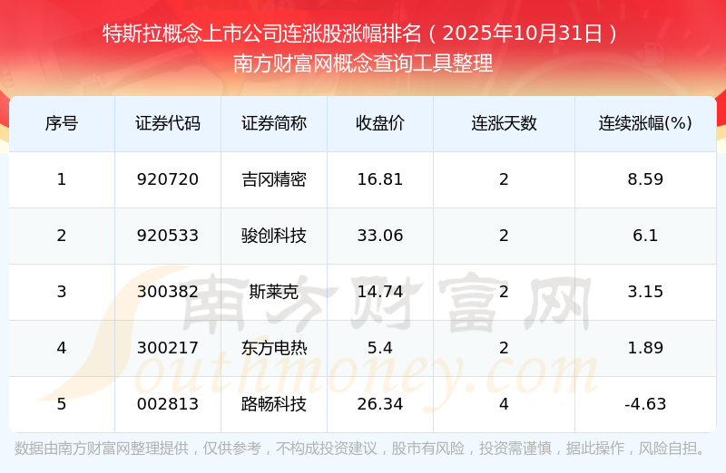 2025年10月31日特斯拉概念上市公司連漲股漲幅排名