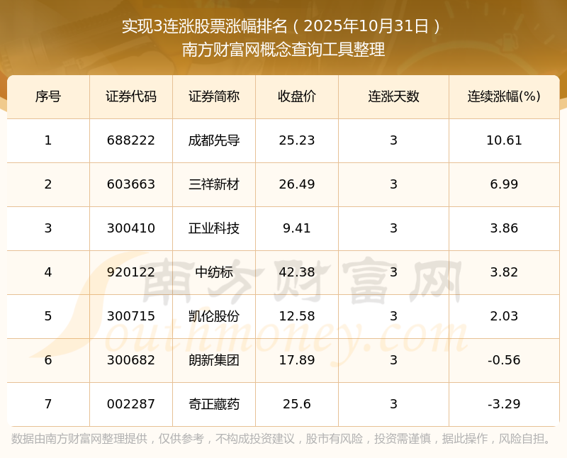 根據(jù)南方財(cái)富網(wǎng)概念查詢工具數(shù)據(jù)統(tǒng)計(jì),截止2025年10月31日收盤,共有7只個股實(shí)現(xiàn)3天連漲。其中連續(xù)漲幅較大的個股有成都先導(dǎo)、三祥新材、正業(yè)科技等,連續(xù)漲幅分別為10.61%、6.99%、3.86%。