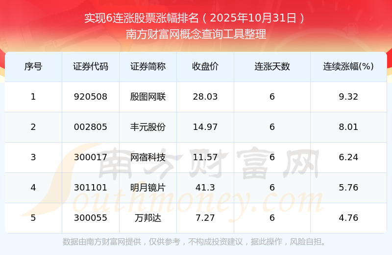 2025年10月31日實現(xiàn)6連漲股票漲幅排名
