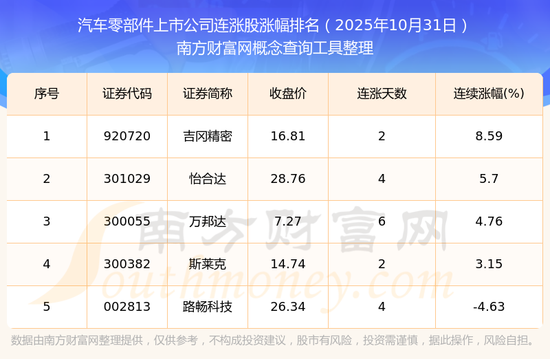 2025年10月31日汽車零部件上市公司連漲股漲幅排名