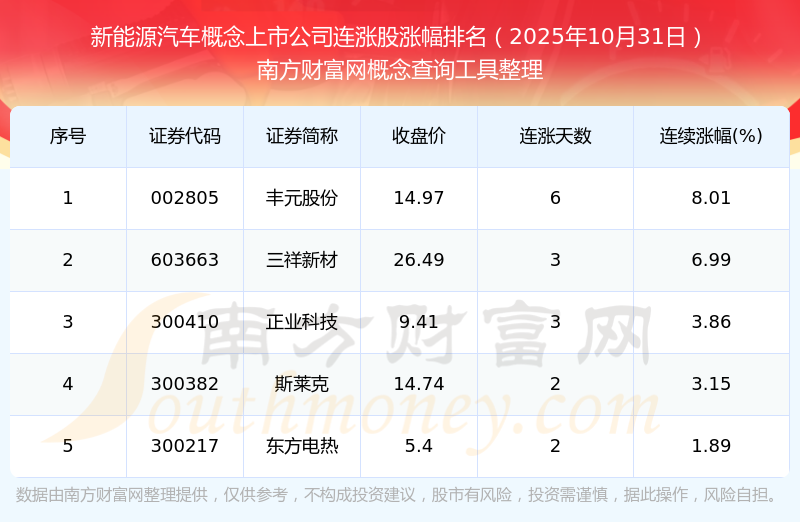 2025年10月31日新能源汽車概念上市公司連漲股漲幅排名