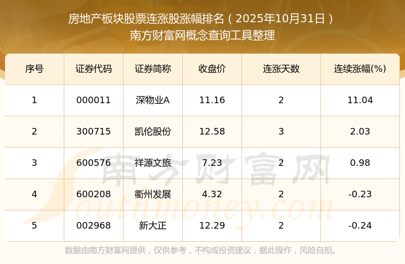 根據(jù)南方財(cái)富網(wǎng)概念查詢工具數(shù)據(jù)統(tǒng)計(jì),截止2025年10月31日收盤(pán),房地產(chǎn)板塊股票共有5只個(gè)股實(shí)現(xiàn)連漲。其中連續(xù)漲幅較大的個(gè)股有深物業(yè)A、凱倫股份、祥源文旅等,連續(xù)漲幅分別為11.04%、2.03%、0.98%。