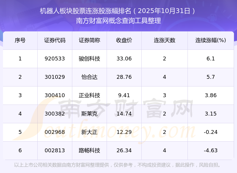 根據(jù)南方財(cái)富網(wǎng)概念查詢工具數(shù)據(jù)統(tǒng)計(jì),截止2025年10月31日收盤,機(jī)器人板塊股票共有6只個(gè)股實(shí)現(xiàn)連漲。其中連續(xù)漲幅較大的個(gè)股有駿創(chuàng)科技、怡合達(dá)、正業(yè)科技等,連續(xù)漲幅分別為6.10%、5.70%、3.86%。