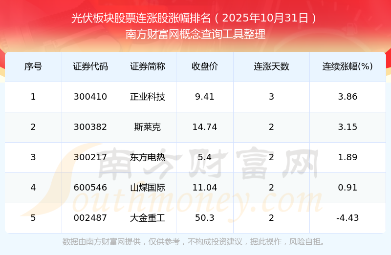 根據(jù)南方財富網(wǎng)概念查詢工具數(shù)據(jù)統(tǒng)計,截止2025年10月31日收盤,光伏板塊股票共有5只個股實現(xiàn)連漲。其中連續(xù)漲幅較大的個股有正業(yè)科技、斯萊克、東方電熱等,連續(xù)漲幅分別為3.86%、3.15%、1.89%。