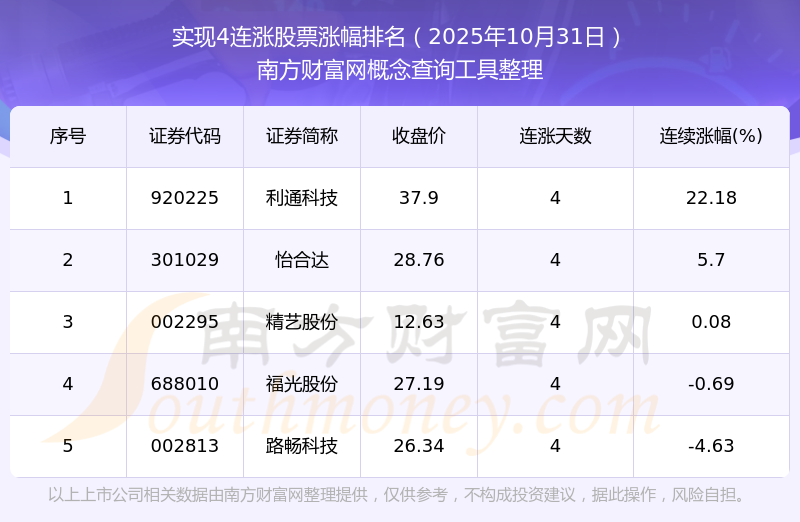 根據(jù)南方財(cái)富網(wǎng)概念查詢工具數(shù)據(jù)統(tǒng)計(jì),截止2025年10月31日收盤,共有5只個股實(shí)現(xiàn)4天連漲。其中連續(xù)漲幅較大的個股有利通科技、怡合達(dá)、精藝股份等,連續(xù)漲幅分別為22.18%、5.70%、0.08%。