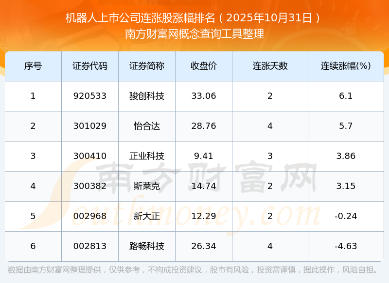 2025年10月31日機器人上市公司連漲股漲幅排名