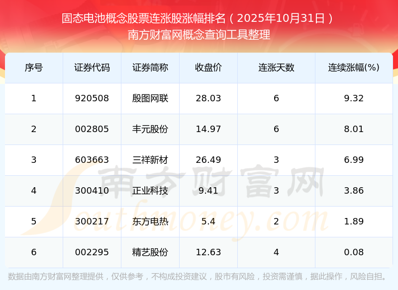 根據(jù)南方財(cái)富網(wǎng)概念查詢工具數(shù)據(jù)統(tǒng)計(jì),截止2025年10月31日收盤,固態(tài)電池概念股票共有6只個(gè)股實(shí)現(xiàn)連漲。其中連續(xù)漲幅較大的個(gè)股有殷圖網(wǎng)聯(lián)、豐元股份、三祥新材等,連續(xù)漲幅分別為9.32%、8.01%、6.99%。
