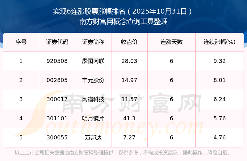 2025年10月31日實現(xiàn)6連漲股票漲幅排名