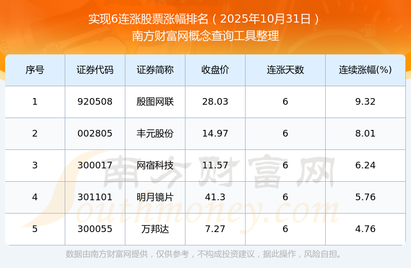 2025年10月31日實現(xiàn)6連漲股票漲幅排名