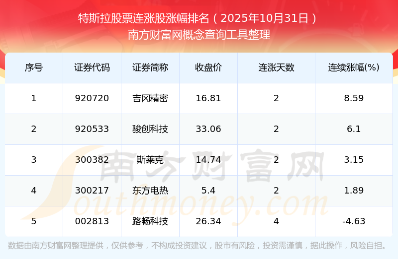 根據(jù)南方財(cái)富網(wǎng)概念查詢工具數(shù)據(jù)統(tǒng)計(jì),截止2025年10月31日收盤(pán),特斯拉股票共有5只個(gè)股實(shí)現(xiàn)連漲。其中連續(xù)漲幅較大的個(gè)股有吉岡精密、駿創(chuàng)科技、斯萊克等,連續(xù)漲幅分別為8.59%、6.10%、3.15%。