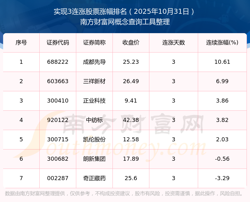 2025年10月31日實(shí)現(xiàn)3連漲股票漲幅排名