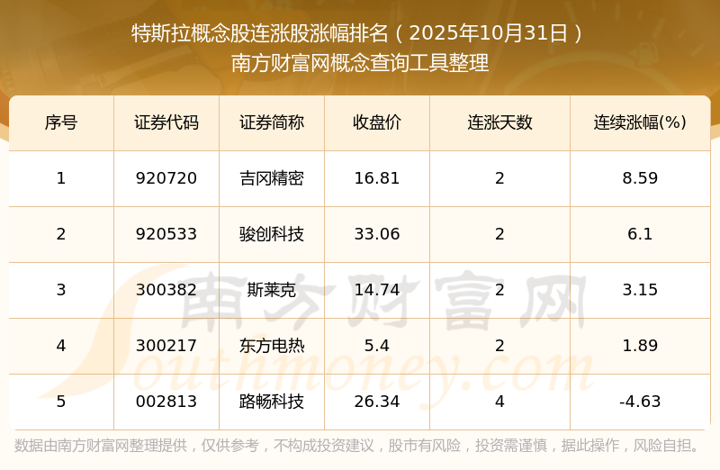 2025年10月31日特斯拉概念股連漲股票漲幅排名