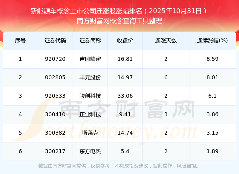 根據(jù)南方財(cái)富網(wǎng)概念查詢工具數(shù)據(jù)統(tǒng)計(jì),截止2025年10月31日收盤,新能源車概念上市公司共有6只個(gè)股實(shí)現(xiàn)連漲。其中連續(xù)漲幅較大的個(gè)股有吉岡精密、豐元股份、駿創(chuàng)科技等,連續(xù)漲幅分別為8.59%、8.01%、6.10%。