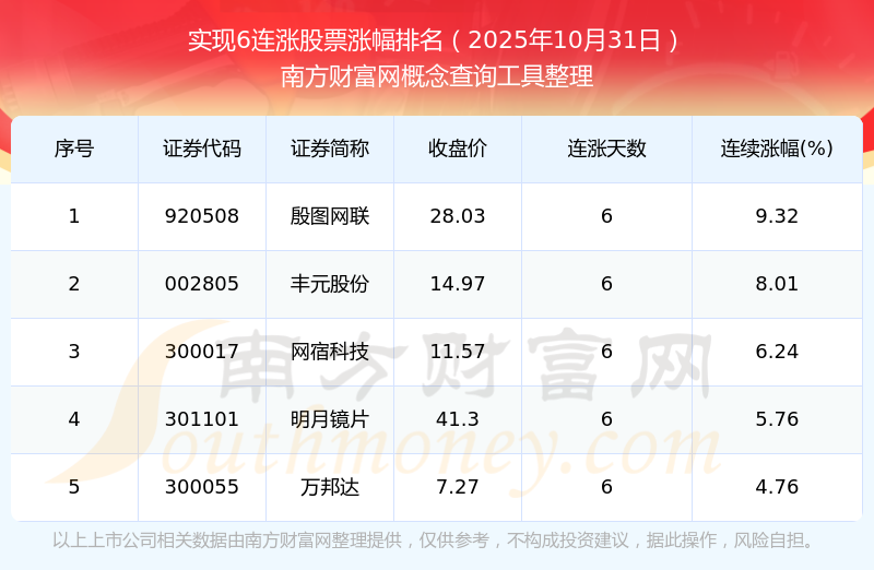 根據(jù)南方財(cái)富網(wǎng)概念查詢工具數(shù)據(jù)統(tǒng)計(jì),截止2025年10月31日收盤,共有5只個(gè)股實(shí)現(xiàn)6天連漲。其中連續(xù)漲幅較大的個(gè)股有殷圖網(wǎng)聯(lián)、豐元股份、網(wǎng)宿科技等,連續(xù)漲幅分別為9.32%、8.01%、6.24%。 2025年10月31日實(shí)現(xiàn)6連漲股票漲幅排名 數(shù)據(jù)由南方財(cái)富網(wǎng)整理提供,
