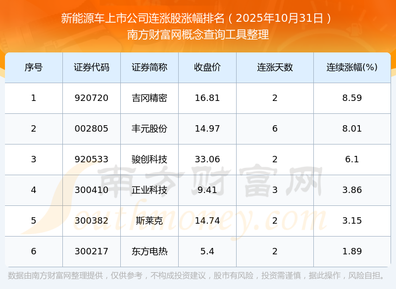 根據(jù)南方財富網(wǎng)概念查詢工具數(shù)據(jù)統(tǒng)計,截止2025年10月31日收盤,新能源車上市公司共有6只個股實現(xiàn)連漲。其中連續(xù)漲幅較大的個股有吉岡精密、豐元股份、駿創(chuàng)科技等,連續(xù)漲幅分別為8.59%、8.01%、6.10%。