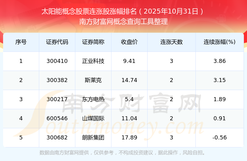 根據(jù)南方財富網(wǎng)概念查詢工具數(shù)據(jù)統(tǒng)計,截止2025年10月31日收盤,太陽能概念股票共有5只個股實現(xiàn)連漲。其中連續(xù)漲幅較大的個股有正業(yè)科技、斯萊克、東方電熱等,連續(xù)漲幅分別為3.86%、3.15%、1.89%。
