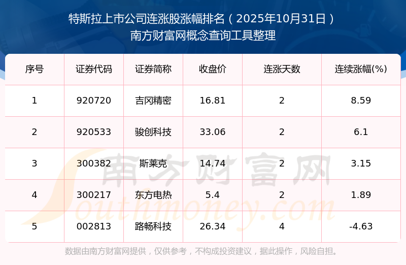 2025年10月31日特斯拉上市公司連漲股漲幅排名