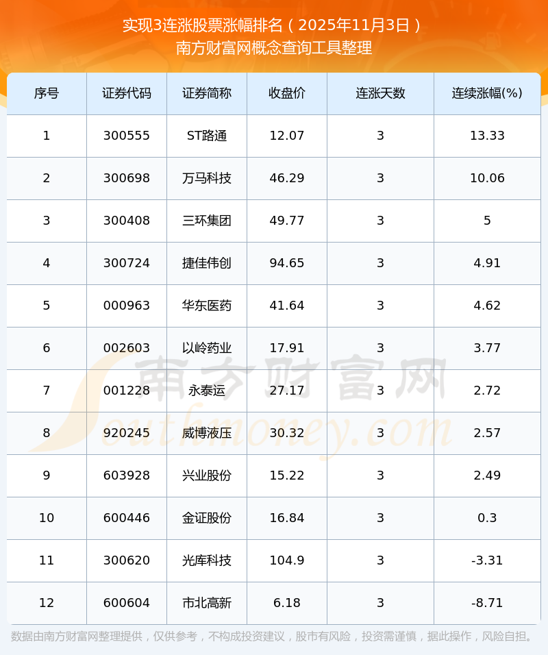 根據(jù)南方財富網(wǎng)概念查詢工具數(shù)據(jù)統(tǒng)計,截止2025年11月3日收盤,共有12只個股實(shí)現(xiàn)3天連漲。其中連續(xù)漲幅較大的個股有ST路通、萬馬科技、三環(huán)集團(tuán)等,連續(xù)漲幅分別為13.33%、10.06%、5.00%。