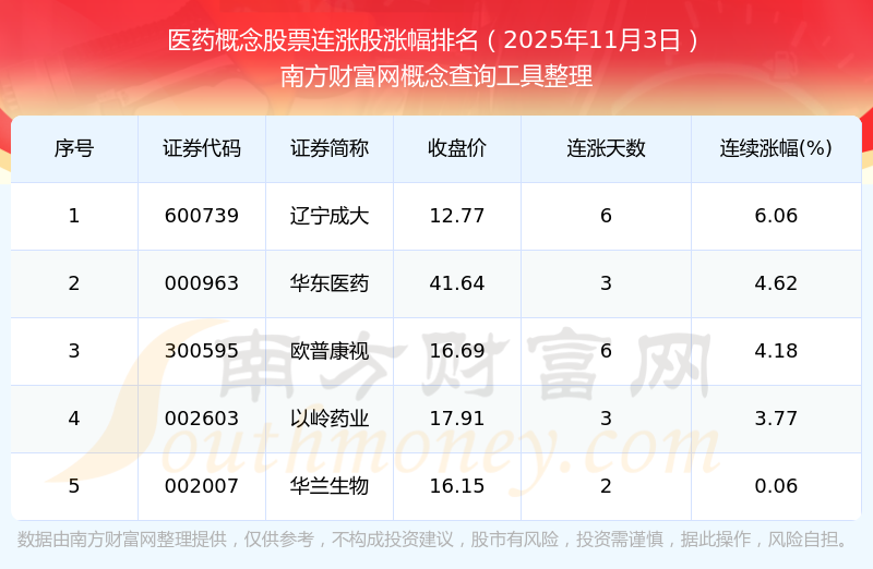 2025年11月3日醫(yī)藥概念股票連漲股漲幅排名