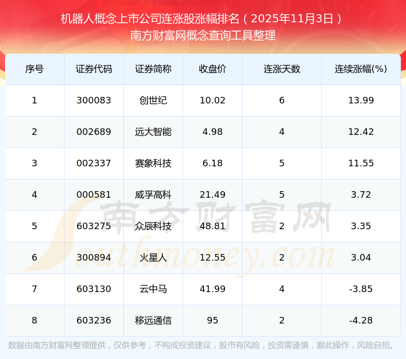 2025年11月3日機(jī)器人概念上市公司連漲股漲幅排名
