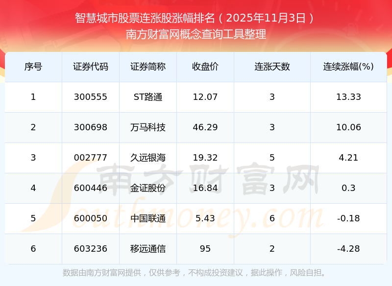2025年11月3日智慧城市股票連漲股漲幅排名
