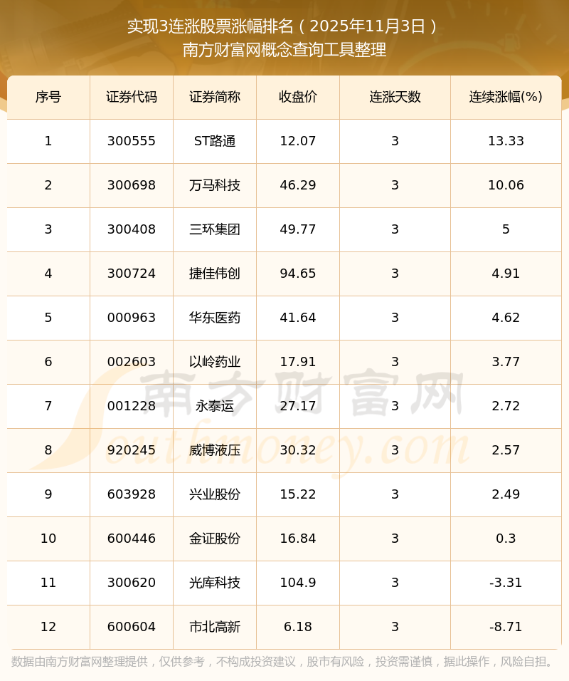 根據(jù)南方財(cái)富網(wǎng)概念查詢工具數(shù)據(jù)統(tǒng)計(jì),截止2025年11月3日收盤(pán),共有12只個(gè)股實(shí)現(xiàn)3天連漲。其中連續(xù)漲幅較大的個(gè)股有ST路通、萬(wàn)馬科技、三環(huán)集團(tuán)等,連續(xù)漲幅分別為13.33%、10.06%、5.00%。